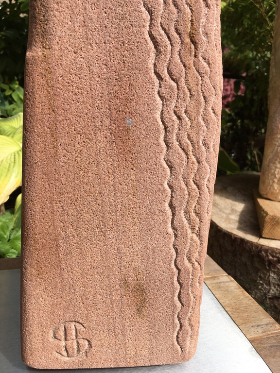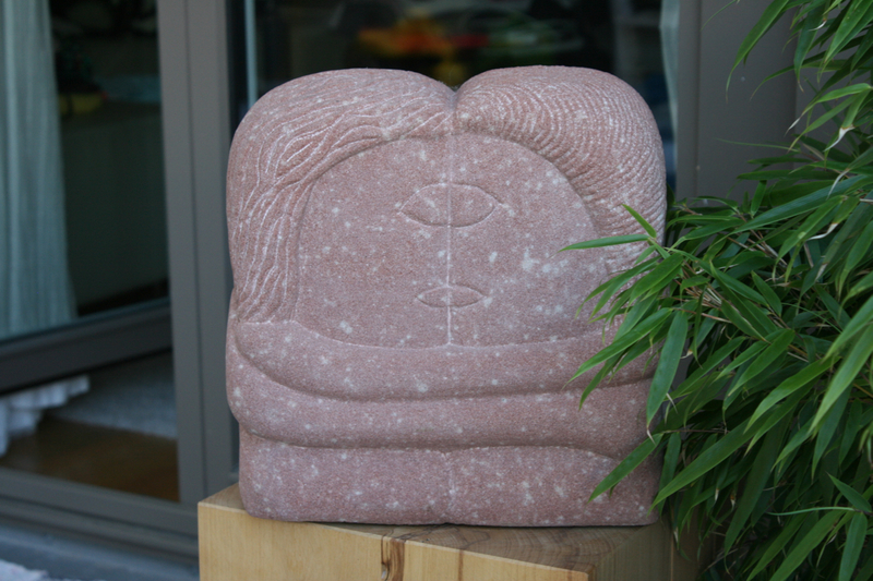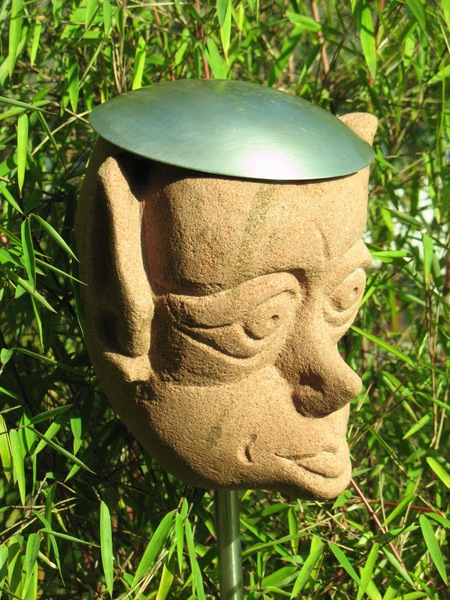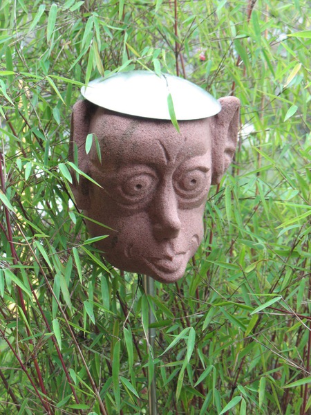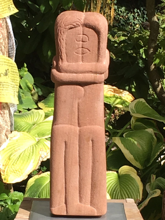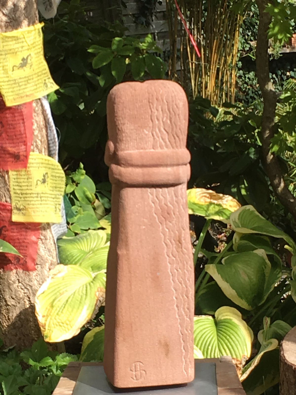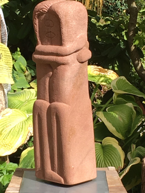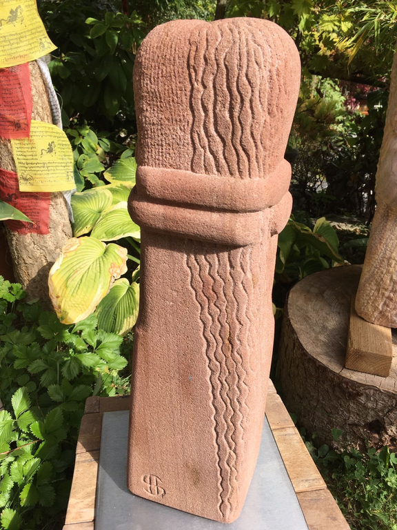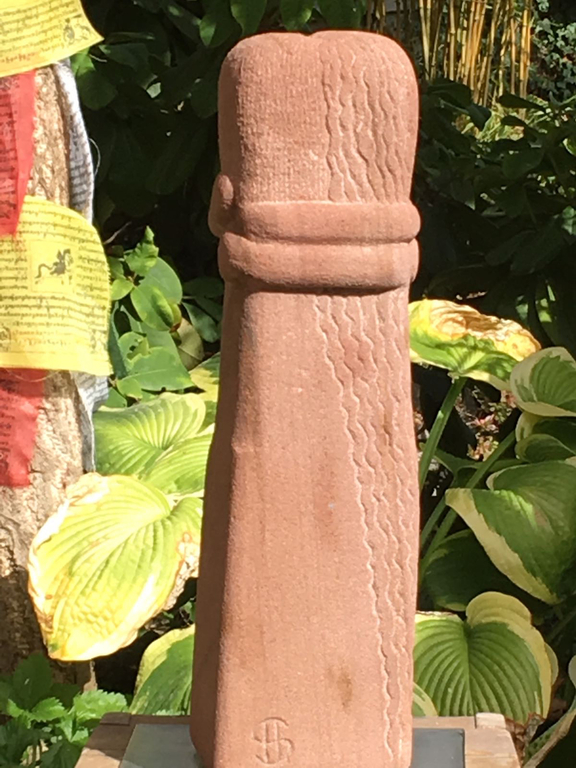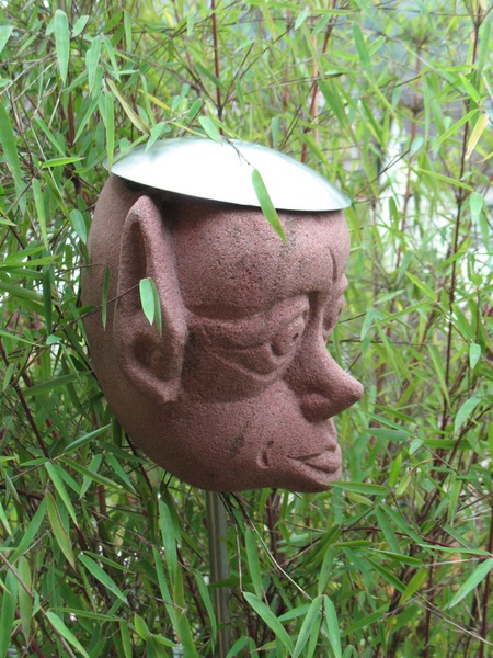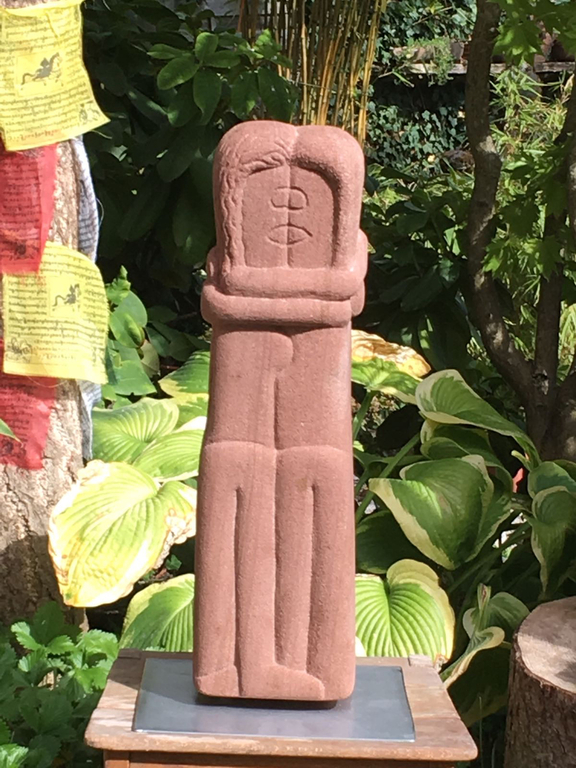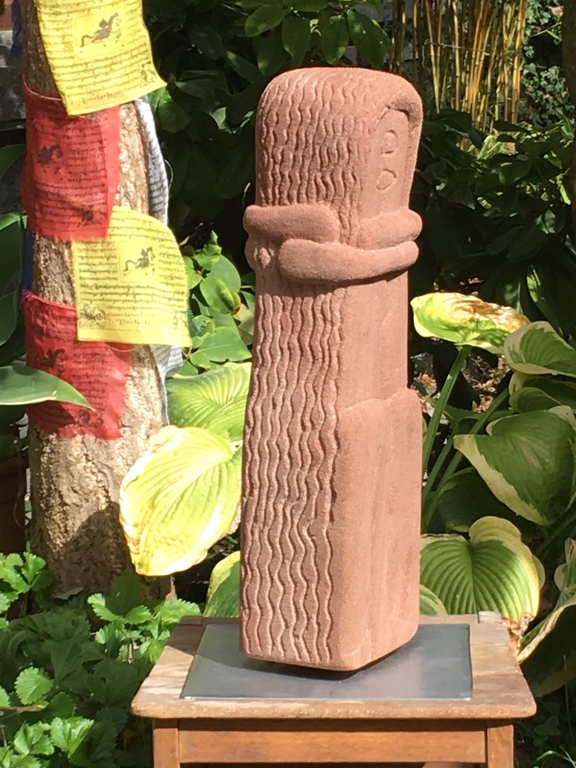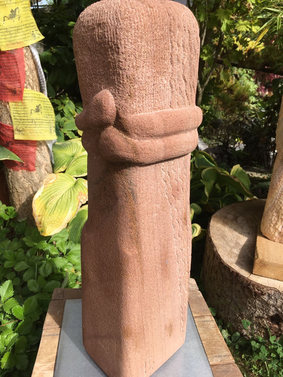 Ein vorwitziger kleiner Gartengeist, der mit großen Augen über sein Reich wacht. Auch bei dieser Skulptur spiele ich mit einem Materialmix aus Sandstein und Edelstahl (Hüttchen).