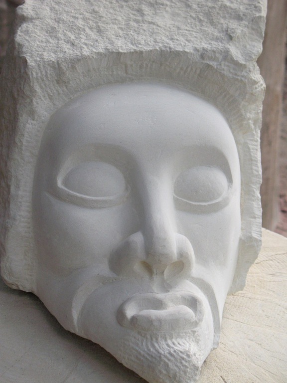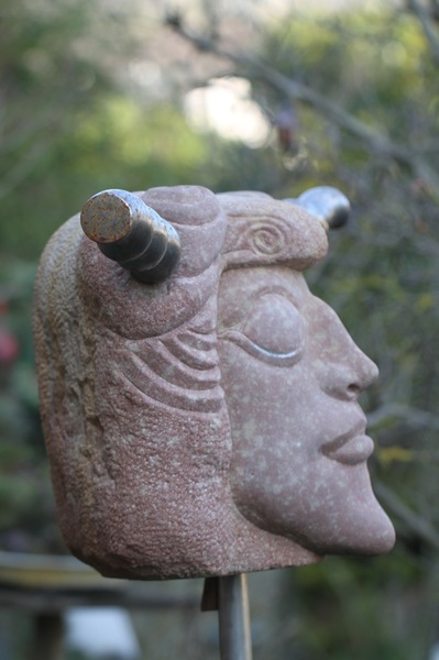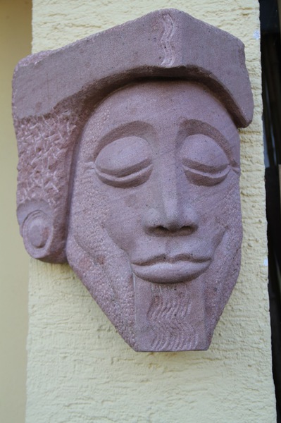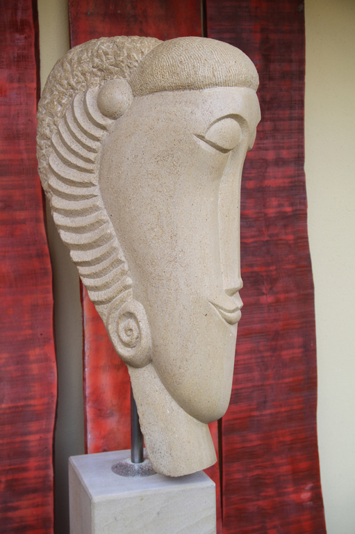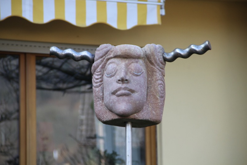 Der MINOTAURUS ist eine Gestalt aus der griechischen Mythologie, ein Mischwesen mit menschlichem Körper und Stierkopf. Diese Heterogenität spiegelt sich auch im eingesetzten Material wieder: Der warme Charakter des Sandstein steht im Kontrast zum kühl-metallischem Glanz der Hörner aus Edelstahl.